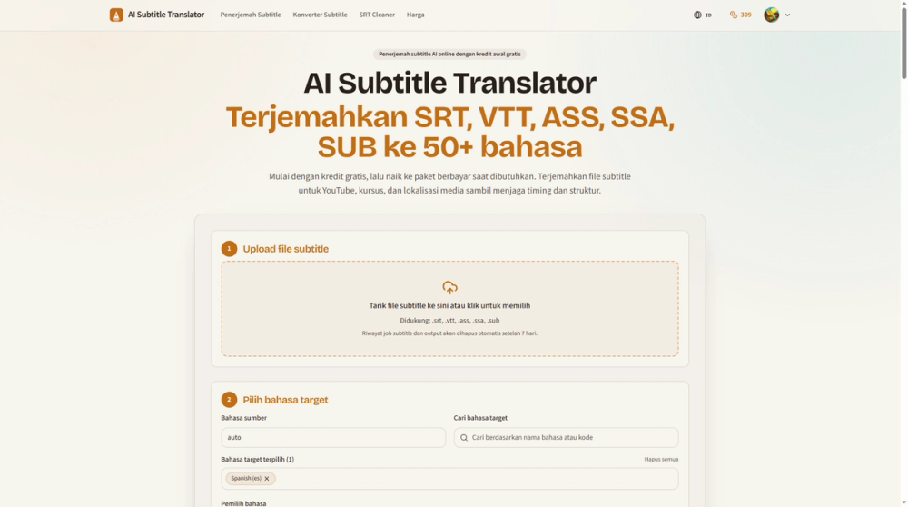 AI Subtitle Translator translates subtitle files (SRT, VTT, ASS, SSA, SUB) into 50+ languages with format-aware parsing that preserves cue order and timestamps. It offers free starter credits, transparent credit estimates, multi-language output in one run, and paid plans or one-time credit packs for subtitle localization workflows.