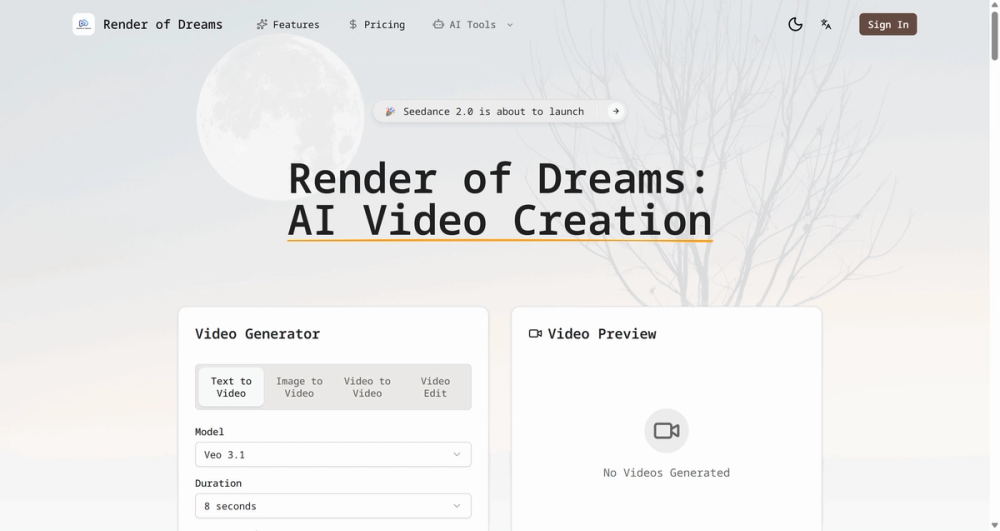 Render of Dreams is a cutting-edge AI video creation ecosystem crafted for modern creators, serving as a sophisticated, user-centric interface that unlocks access to the world’s most powerful video generation engines—Sora2, Veo3.1 and Seedance. More than a mere video generator, it democratizes elite video synthesis by eliminating the traditional high barriers of high-end production, which once demanded costly professional equipment and years of technical expertise. With this platform, users of all skill levels can effortlessly generate professional-grade, high-fidelity videos from simple text prompts, embodying a core philosophy of seamless synergy between human creativity and advanced machine intelligence.